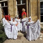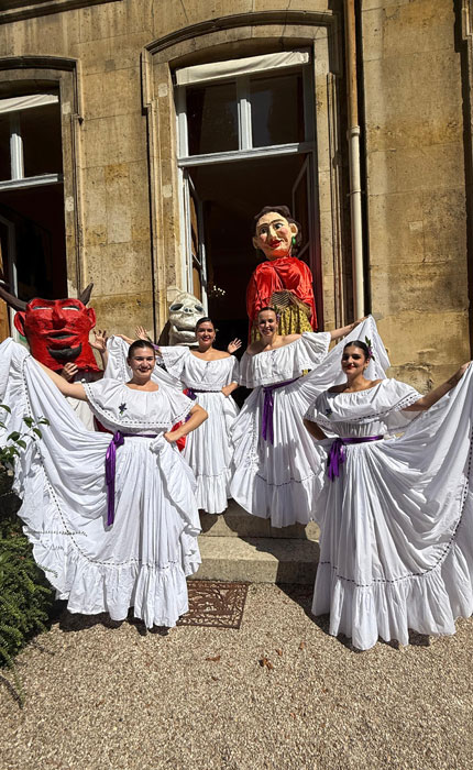 Estas 4 figuras de gran tamaño, elaboradas artesanalmente en papel maché, representan personajes típicos como el diablo, la muerte, la giganta y la negra. Acompañadas por la música vibrante de la cimarrona, las mascaradas recorren las calles durante fiestas patronales, carnavales y eventos culturales, provocando risas, sustos y alegría. En Francia, esta tradición despierta curiosidad y admiración, y se convierte en un puente lúdico entre culturas, mostrando el ingenio y la calidez del pueblo costarricense.